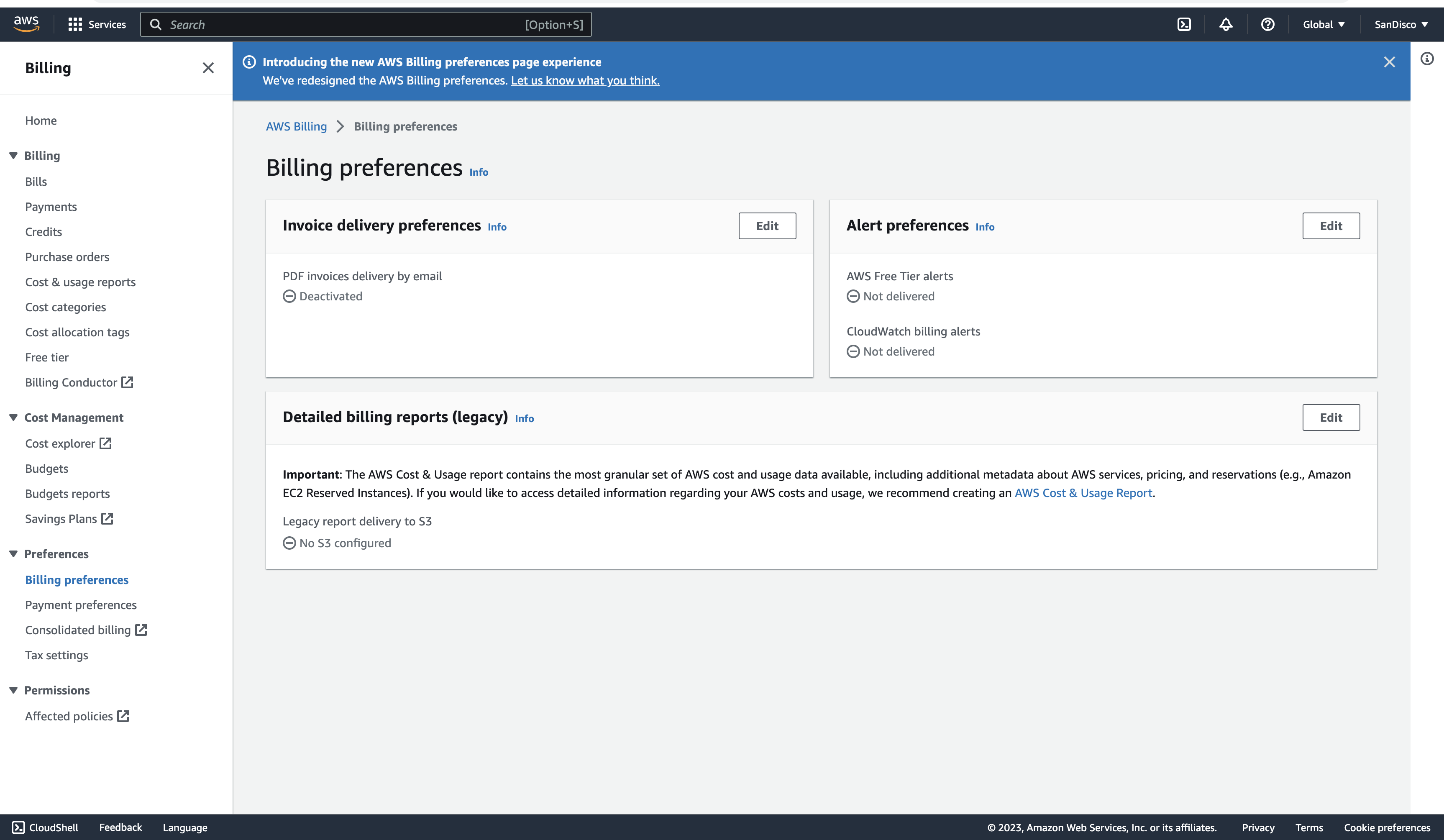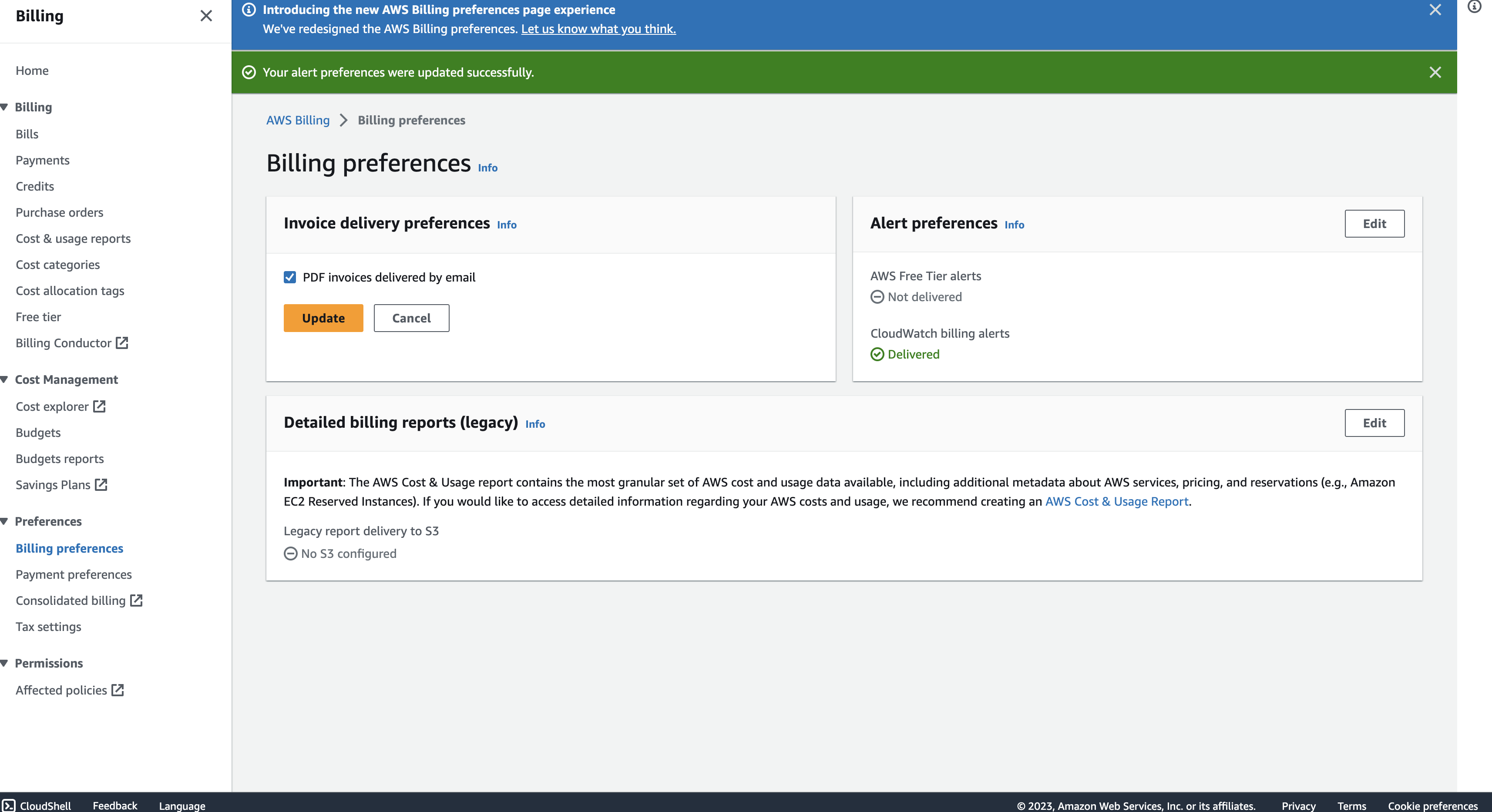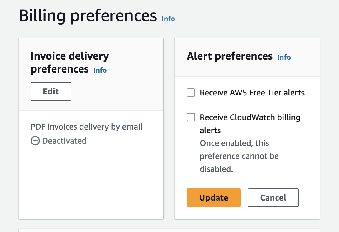 optional Choose Receive AWS Free Tier alerts , enable Receive CloudWatch billing alerts and click update: