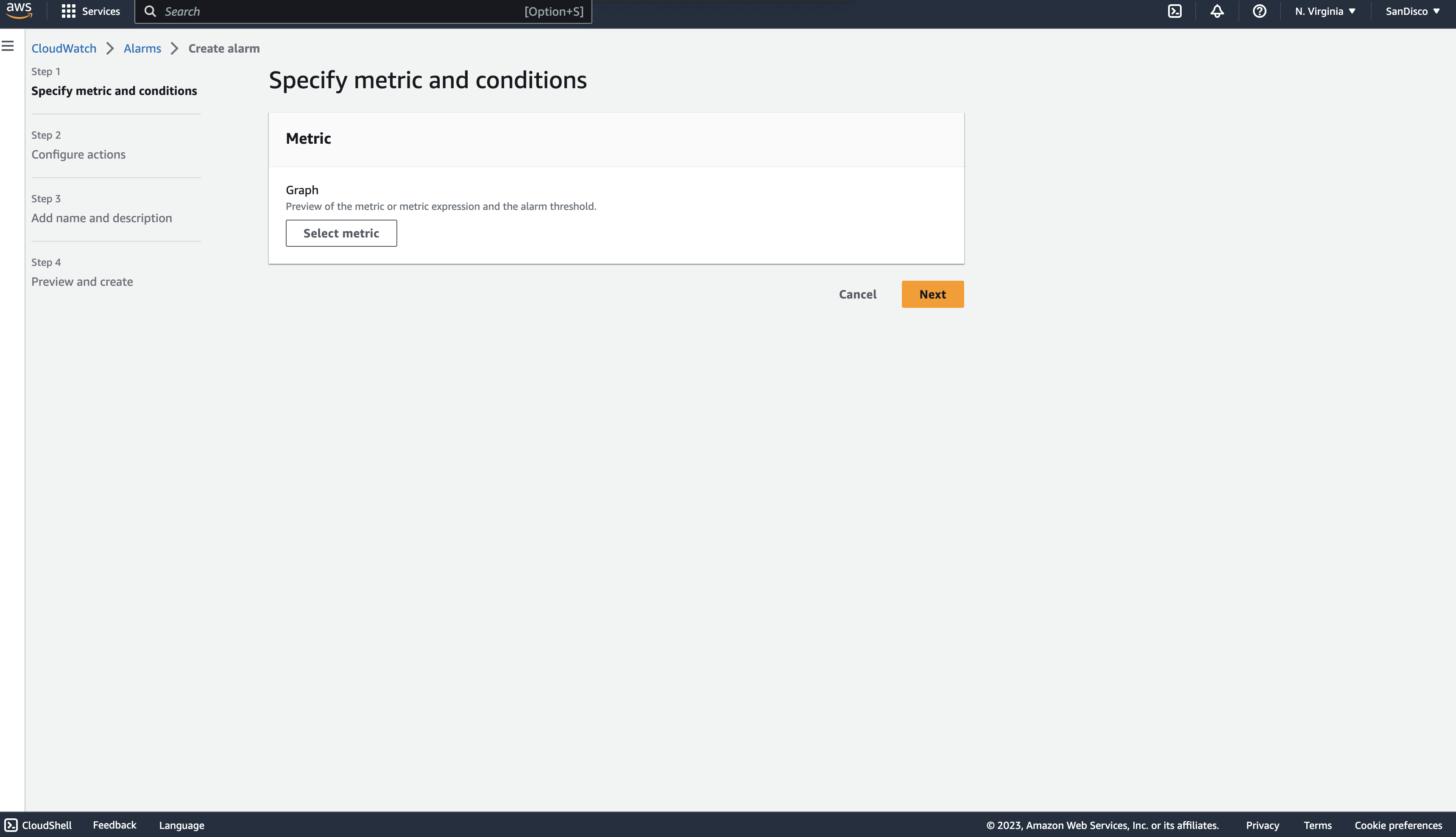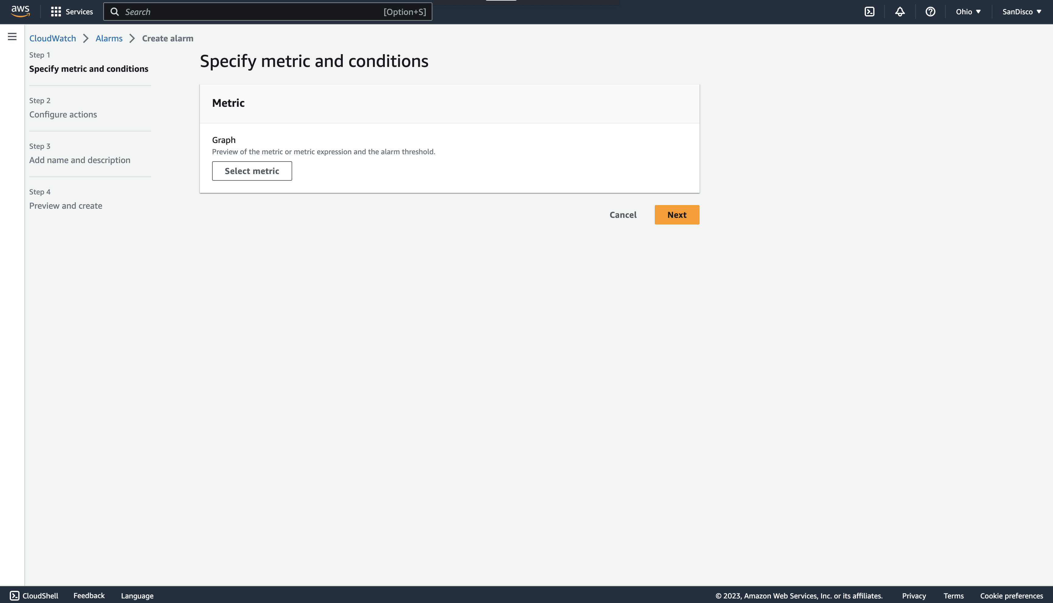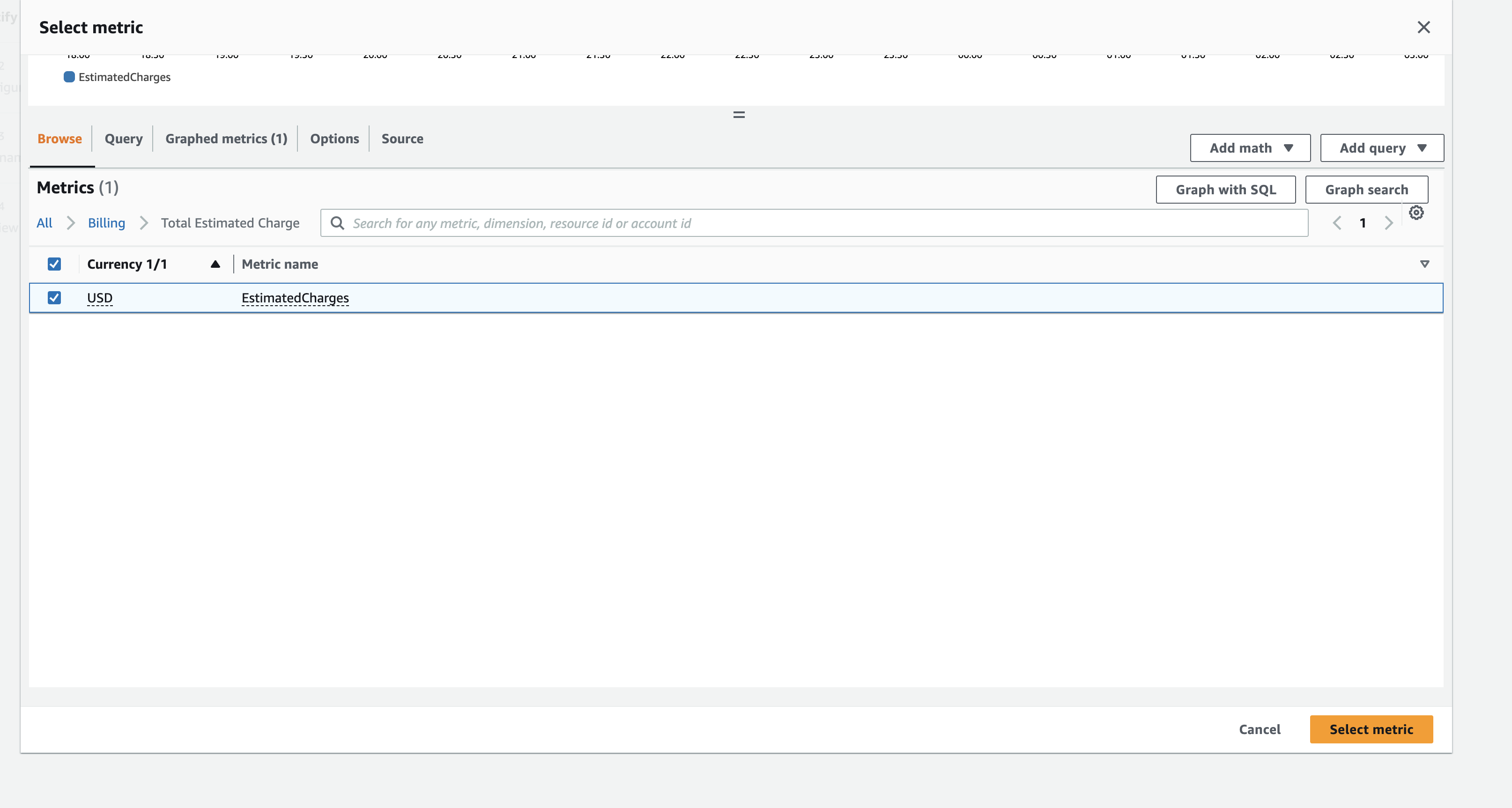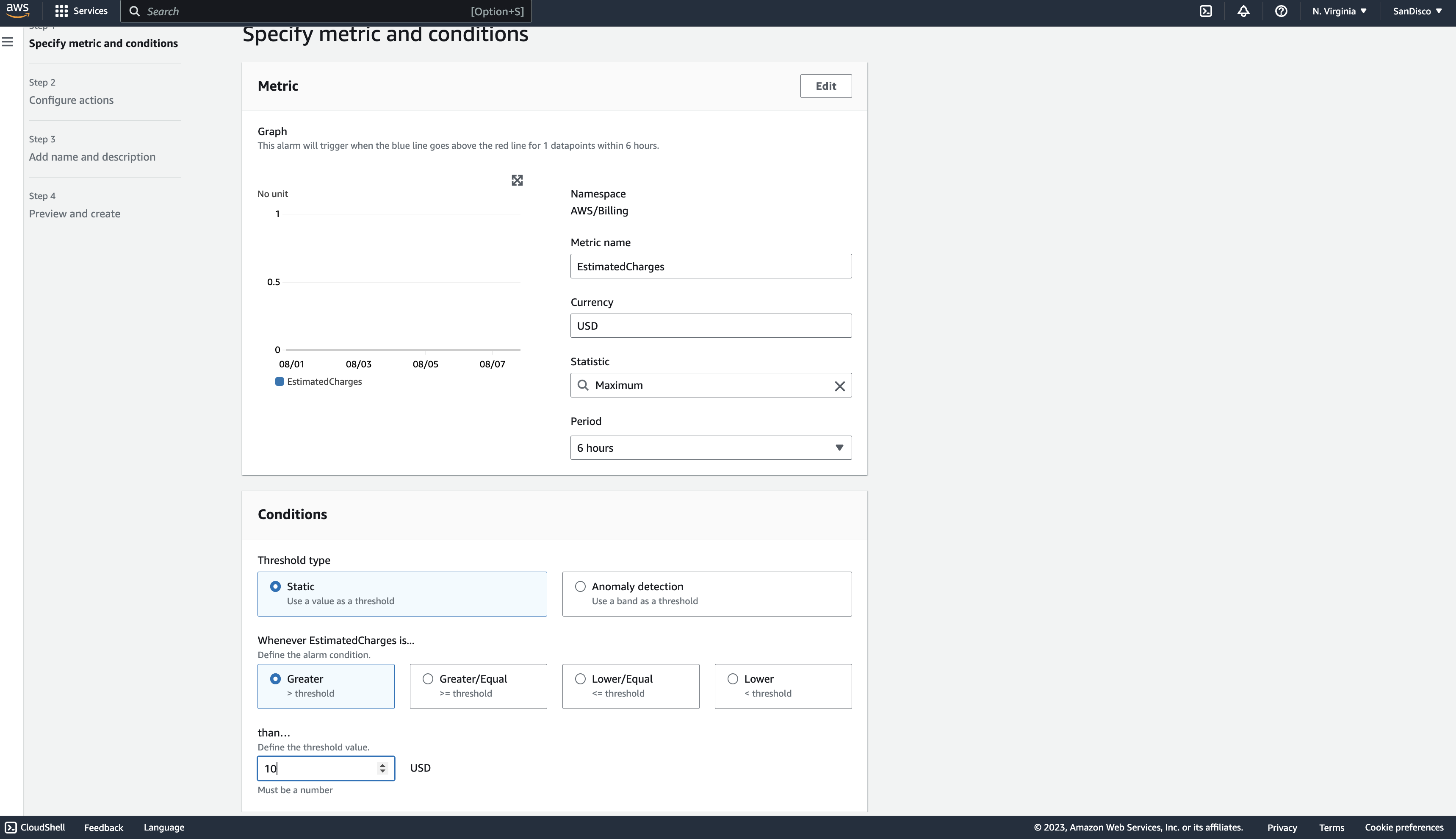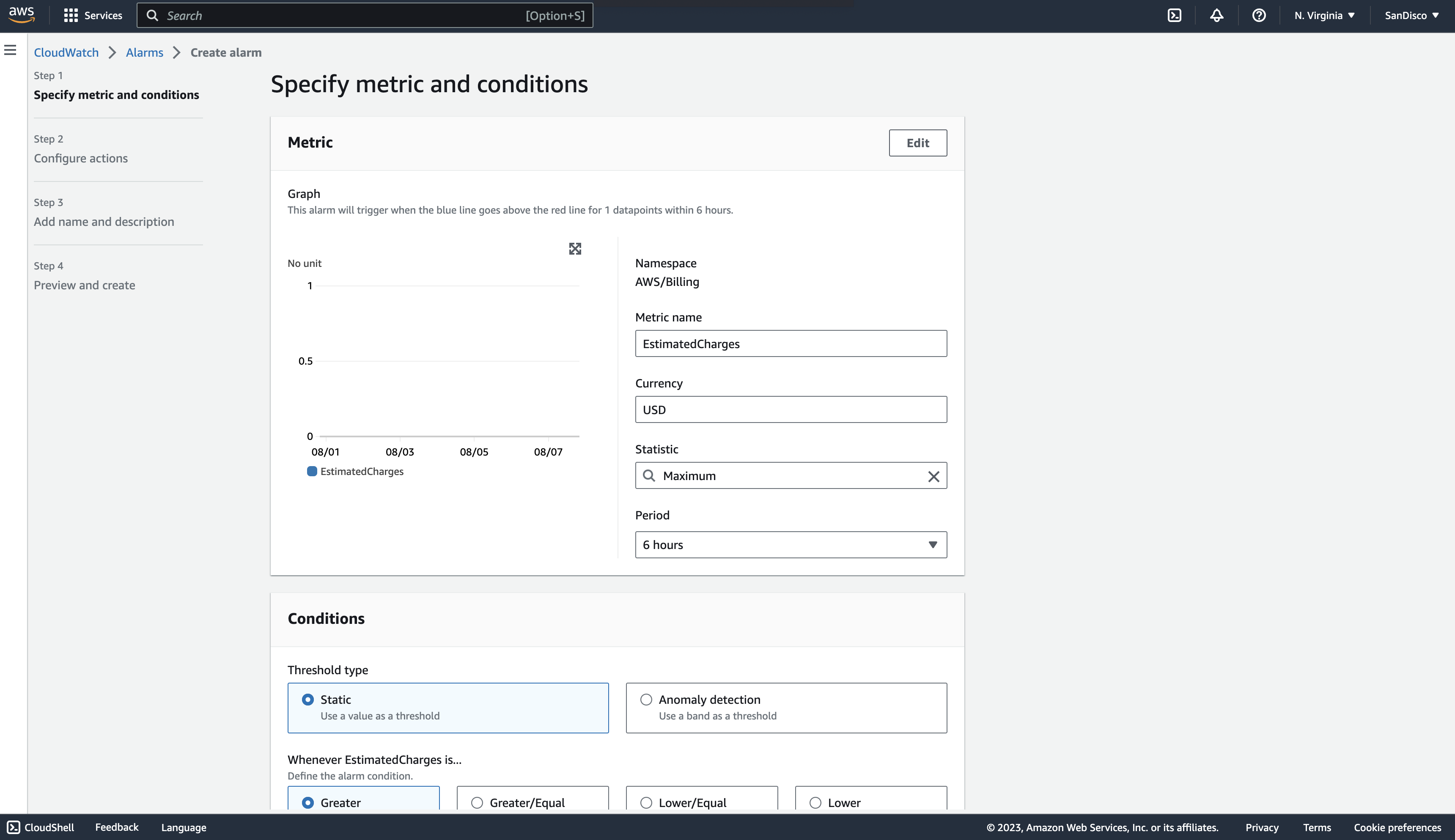 - In the Specify metric and condition page, make sure set the condition and the period, then in the condition, set the threshold for the charge