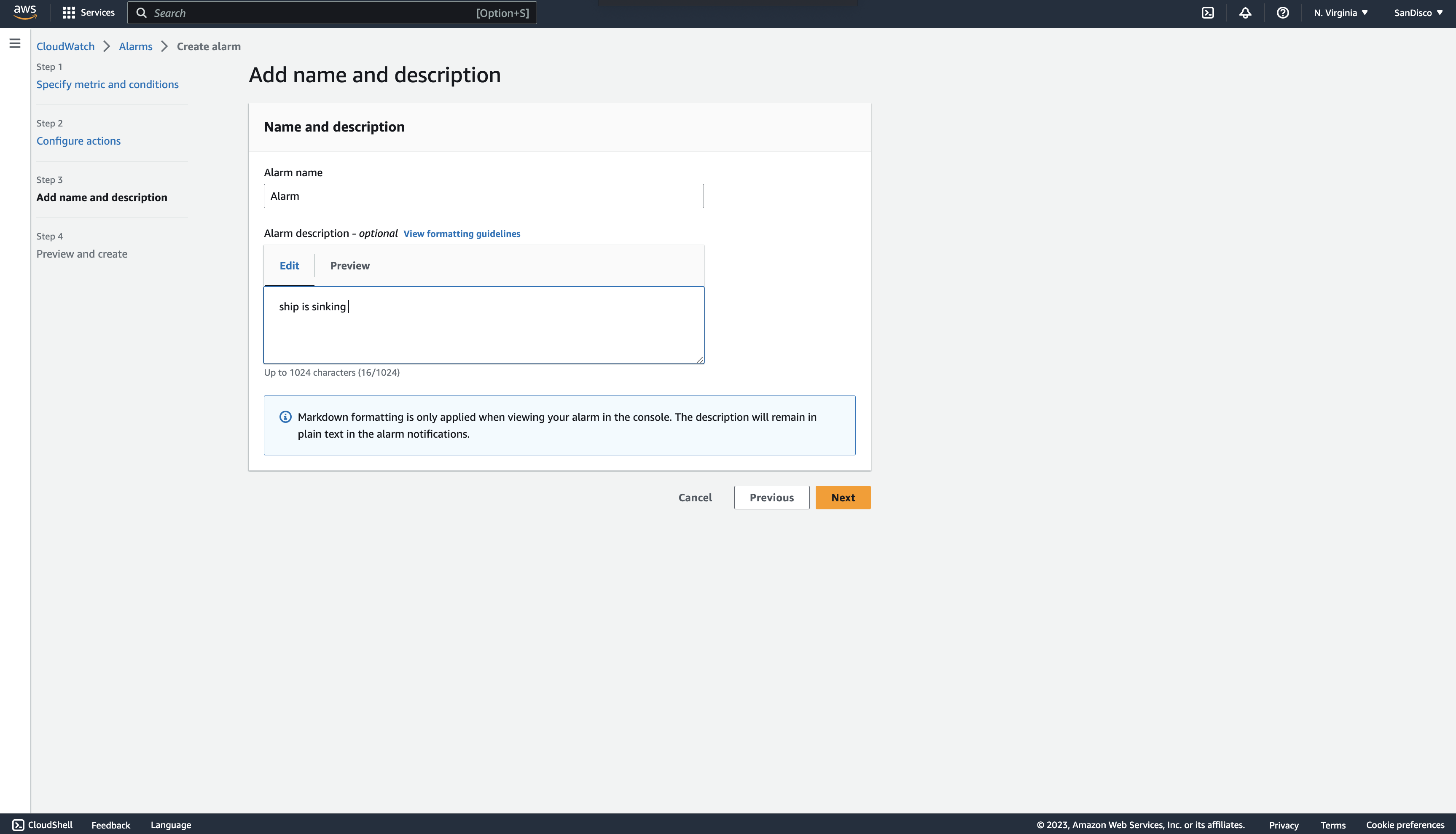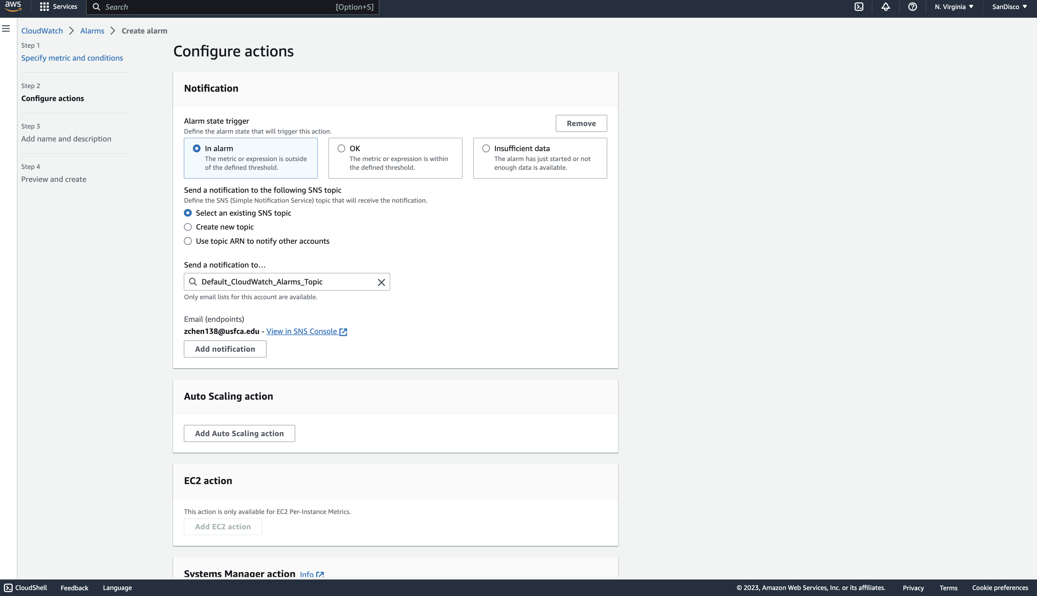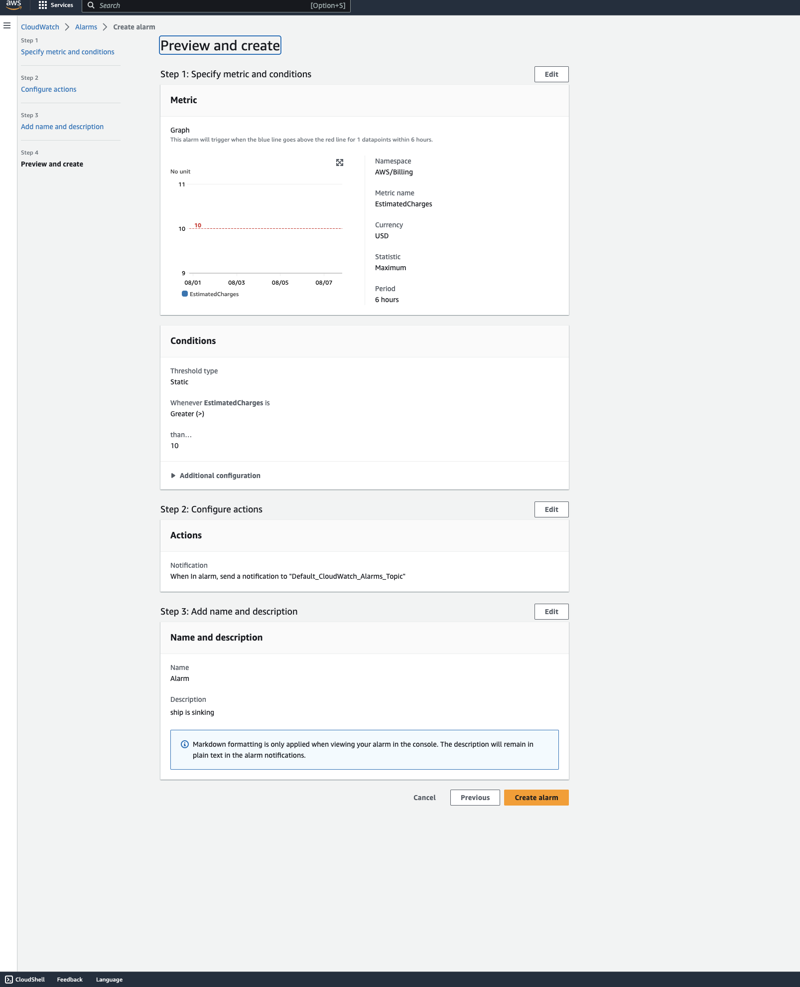 This would notice you when threshold value is exceed. Then click next - Add notification, choose new topic, add an email for notification and then create topic