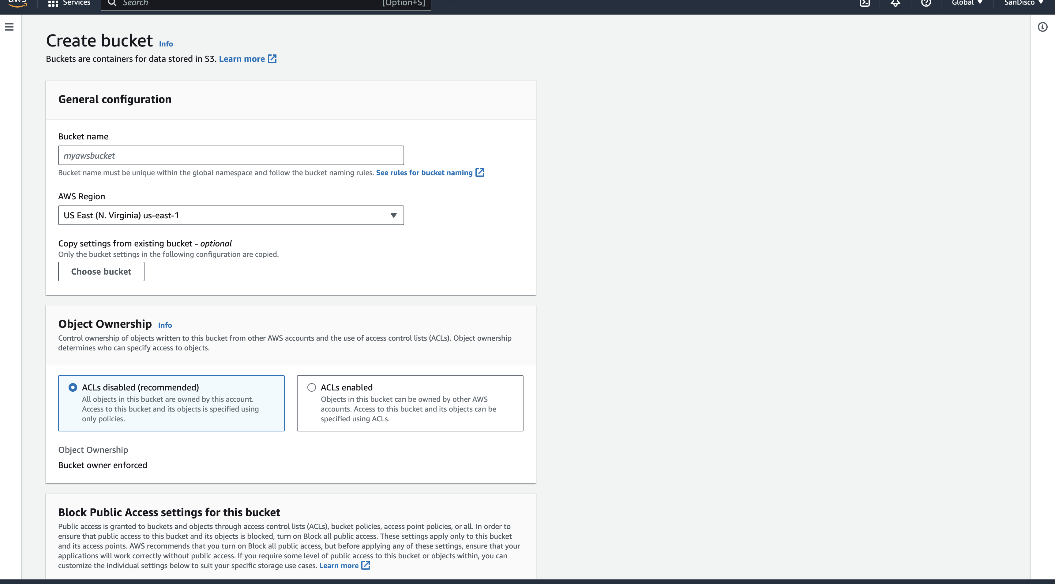 , create bucket name and select ACLs disabled, block all access, disable the versioning. and then create bucket