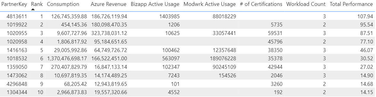 To help Microsoft identify the top partners, a scoring system was implemented to include the influential attributes. Revenue, active users, consumption, and customer count were used to calculate the ranking of partners. This ranking system helped find the top partners in each industry and the certifications completed for the top partners.
