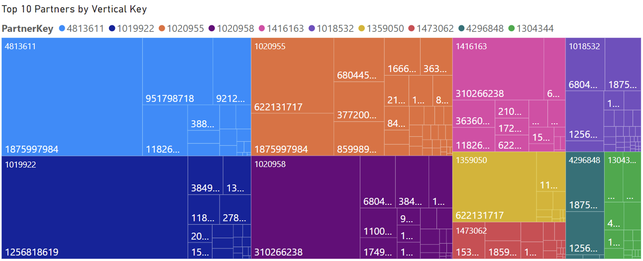 After implementing the scoring system, the top partners were ranked accordingly. A tree map was created with PowerBI to illustrate the top partner and the industries each partner is in. The tree map can be seen in Figure 1. The table in Table 1 also correlates to the top partners. The table outputs the data for each top partner. Both the tree map and the table reinforce the finding that the top partner was Partner 4813611. Partner 4813611 had a consumption of 126,745,359.98, Azure revenue of 186,726,119.94, Bizapp Active Usage of 1,403,985, Modwrk Active Usage of 88,018,229, activity in all 3 workloads, but no certifications. All top 10 partners shown in the table had over 3,000 certifications and most of them were in two if not all three workloads. Another feature the tree map illustrates is that the top 10 partners are in many industries. These insights will help encourage partners who are less successful to expand to more industries or additional workloads.