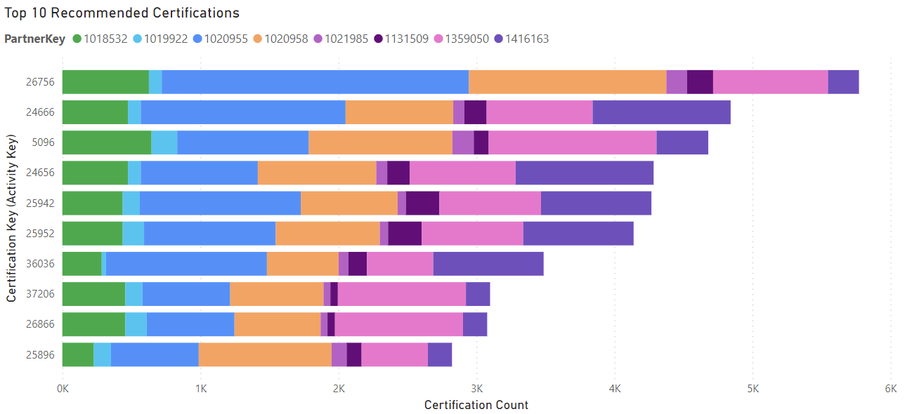 To visualize the recommended training activities, a stacked bar chart was used. Figure 2 demonstrates the top 10 certifications recommended to all Microsoft partners. Only 8 partner keys are shown in the stacked bar chart because 2 of the top 10 partners had no certifications. Partner 1020955 had the most certifications out of the top 10 partners. The certification with the highest number of partners certified was ActivityKey 26756 with over 6,000 certifications. This is the most used certification from the top 10 partners. The chart illustrating the training activities that lead to success will assist the less successful partners in becoming more successful.