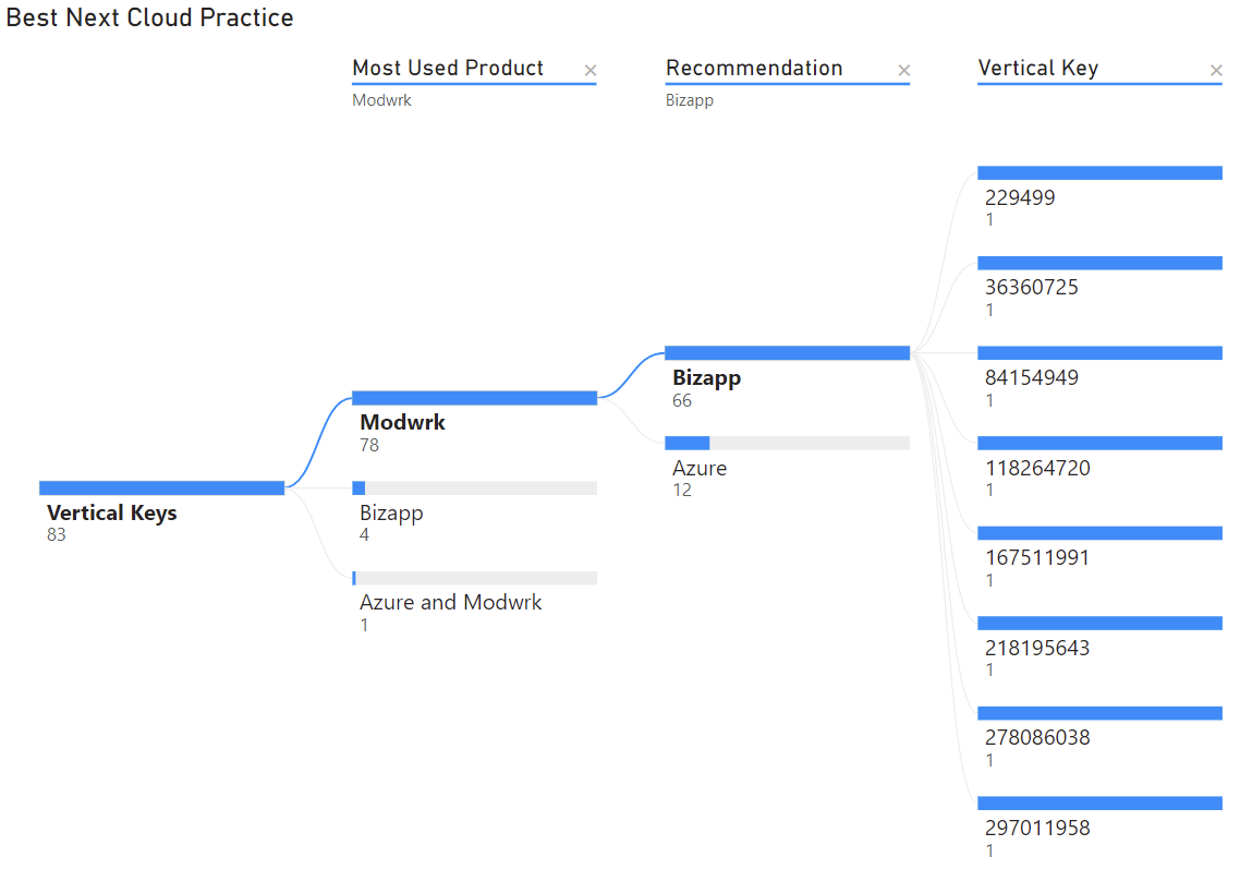 When recommending the next cloud practice a partner should adopt, the user should take the decomposition tree map into account. The decomposition tree map in Figure 4 illustrates the best next cloud practice for partners in a specific industry. There are 83 different industries, and Modwrk is the most used product in 78 of the 83 industries. Of those industries, Bizapp is recommended for 66 of those industries. The decomposition tree illustrates all the vertical keys for each recommended cloud practice. Most partners are recommended to adopt Bizapp. Figure 4 illustrates that Bizapp is the recommended practice for vertical keys 229499, 36360725, and 64 other vertical keys.
