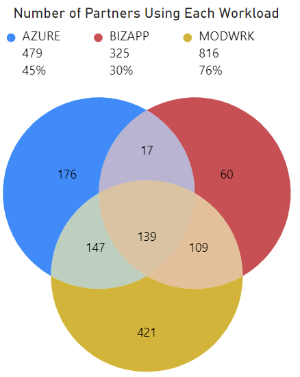 To reiterate, most of the top 10 partners are in 3 workloads, being in multiple workloads leads to more success. The Venn diagram in Figure 5 shows the number of partners that are using each workload. This visual can be used to recommend other workloads that partners can expand to. Exactly 139 partners use all three workloads, 176 partners use only Azure, 60 partners use only Bizapp, and 421 partners use only Modwrk. These insights will help Microsoft determine what workloads is best for partners to expand into.