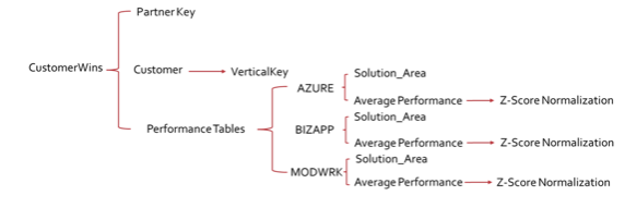 Two modifications of the scoring system were implemented before finding the best one. Scoring system 1.0 was focused on the SolutionArea average performance for each partner and filtered on the specific VerticalKey. The first scoring system was not sufficient because each partner could perform differently in the same SolutionArea based on the VerticalKey they are working in. To combat this, Scoring System 2.0, as seen in Figure 3, is grouped by PartnerKey and VerticalKey which allowed the partner average performance to be used in the SolutionArea based on VerticalKey.